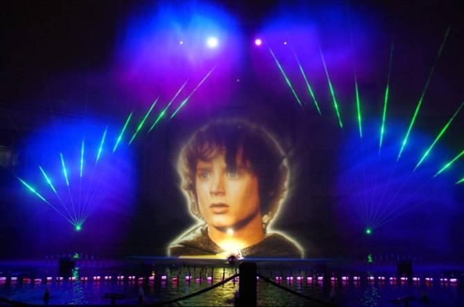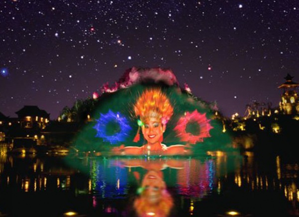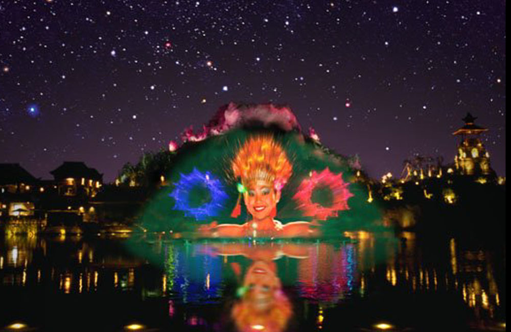 當(dāng)觀眾在觀摩電影時(shí),扇形水幕與自然夜空融為一體,當(dāng)人物出入畫面時(shí),好似人物騰起飛向天空或自天而降,產(chǎn)生一種虛無縹緲和夢幻的感覺,令人神往。各種廣場及闊曠的水面均可安裝水幕電影。