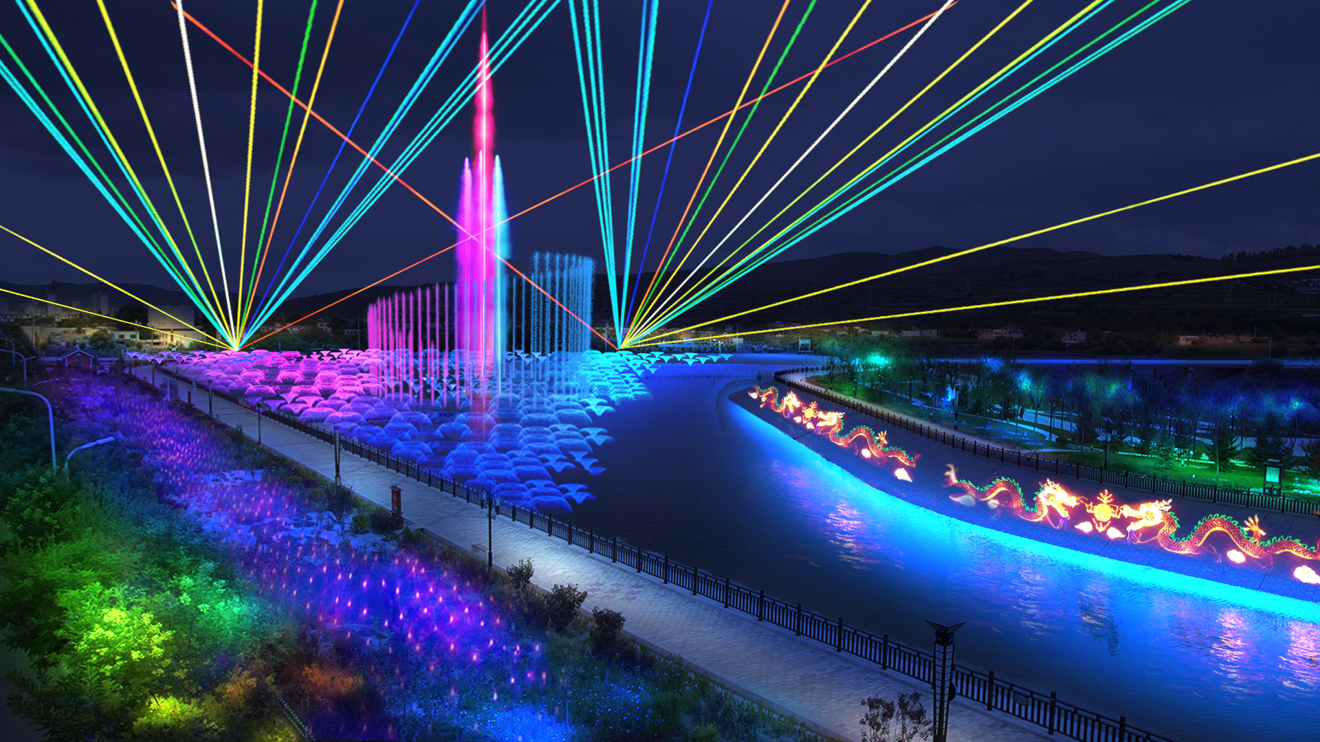 動(dòng)態(tài)燈光:激光燈、水幕投影增強(qiáng)視覺(jué)沖擊力。